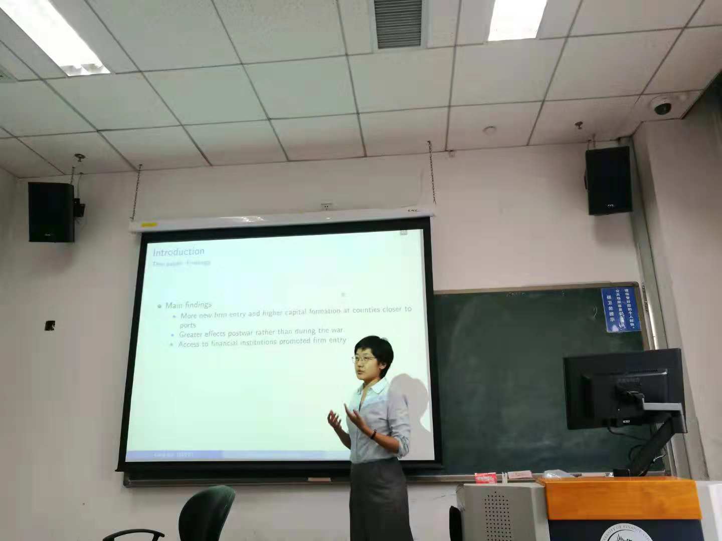 在第一场讲座中,刘老师通过收集历史数据和丰富的历史材料,指出在一战中:国外的棉织品产量下降与国际运费上升的双重因素,导致了国内进口棉织品减少。由于供给的减少,价格上升,吸引了更多国内企业进入棉织品市场。实证方面,刘老师利用1907到1925年的县级数据,在控制县级相关特征的基础上,以各县棉纺织企业数与投资为因变量,利用到港口距离与是否处于一战的交乘项,对棉纺织业发展进行了研究。实证结果表明一战对于国内的棉纺织业发展具有促进作用,并且制度因素在这一过程中起到了巨大的作用。刘老师用中国的历史案例对“进口替代”理论进行了阐释,对于当今中美贸易战背景下我国产业的发展具有一定的借鉴意义。
