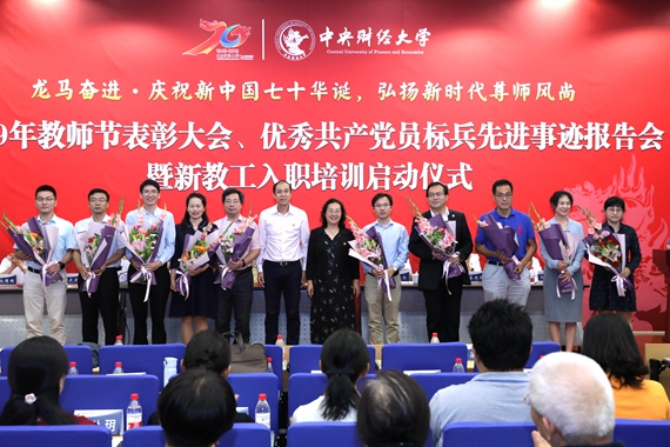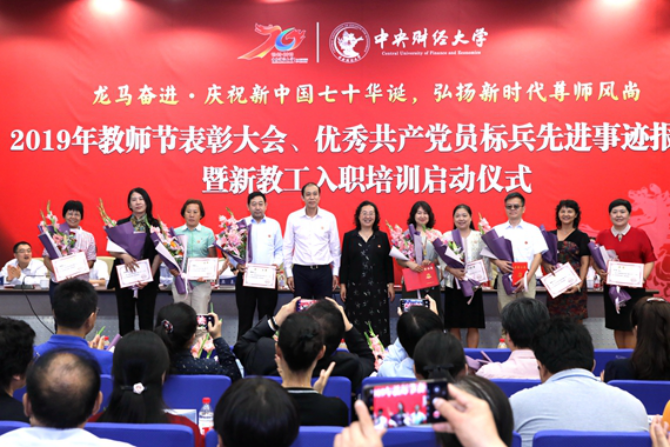 9月10日下午,金沙9001cc以诚为本在学术会堂402举行教师节表彰大会、优秀共产党员标兵先进事迹报告会暨新教工入职培训启动仪式,庆祝第35个教师节,表彰在教书育人等各项工作中取得突出成绩和从教满30年的教职工。校党委书记何秀超、校长王瑶琪、校党委副书记梁勇、副校长史建平、总会计师蔡艳艳,副校长孙国辉、马海涛,校长助理李涛出席大会。大会由校党委副书记、教代会执委会主任、工会主席陈明主持。