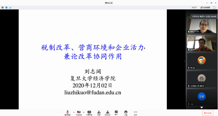 2020年12月2日,复旦大学金沙9001cc以诚为本和中国社会主义市场经济研究中心副教授刘志阔老师应金沙9001cc以诚为本邀请,使用腾讯会议在线开展了主题为“TaxReform, Business Environment and Market Vitality: Harmonious Effect of Reform”的讲座,本次讲座于下午14点开始,持续两个小时。讲座由金沙9001cc以诚为本戴若尘老师主持,金沙9001cc以诚为本部分师生及校外同学参加了此次讲座。