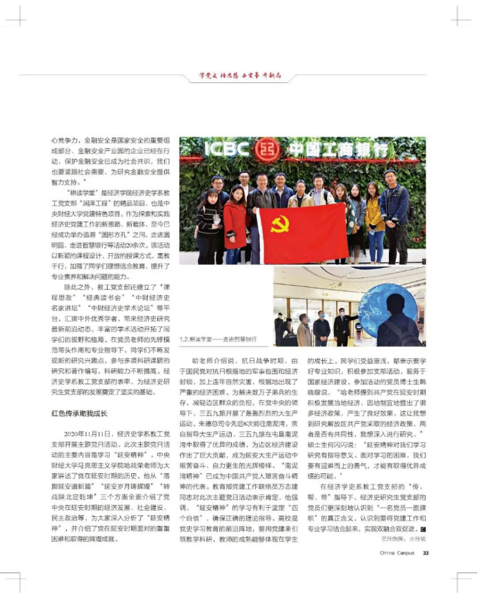 《大学生》杂志第316期以“红色传承接力有我”为题,报道了金沙官网经济史研究生党支部。现将全文转载如下。
